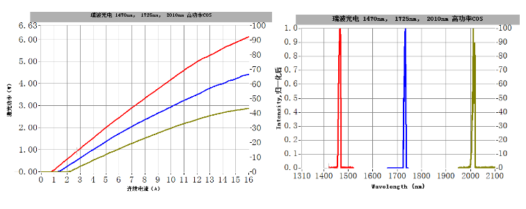 圖2:瑞波5.5W 1470nm芯片(紅)與4W 1725nm芯片(藍)和2.5W 2010nm芯片(綠)性能對比