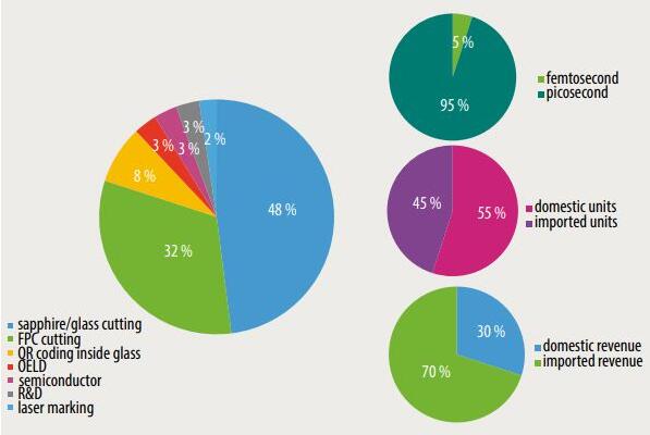 在半導(dǎo)體、顯示器制造和玻璃加工需求的推動(dòng)下,中國(guó)的超快激光市場(chǎng)正在快速增長(zhǎng)。2021,超過(guò)45家制造商在中國(guó)共售出2400臺(tái)激光器。銷售的超快激光器中95%是皮秒激光器。飛秒激光只占據(jù)了很小的市場(chǎng)份額。國(guó)產(chǎn)激光器占總銷量的55%,但僅占總收入的30%,這表明國(guó)產(chǎn)超快激光器的功率水平較低,大多在10至50瓦之間,而進(jìn)口激光器則用于更高功率的應(yīng)用。