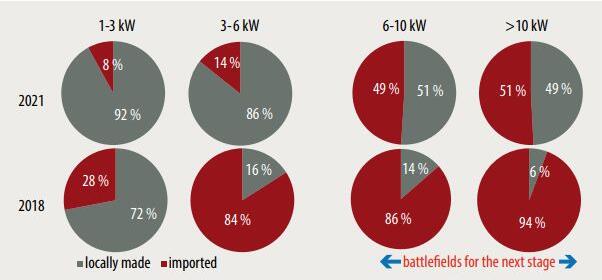 圖2 2018年與2021中國(guó)高功率光纖激光器國(guó)產(chǎn)化趨勢(shì)。