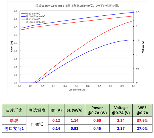 圖1: 638nm 0.5W TO-56與進(jìn)口友商1在T=40℃、CW下PIV對比數(shù)據(jù)