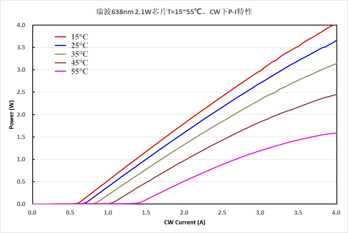 638nm高功率激光芯片和器件,長期以來一直被日本公司壟斷,其產(chǎn)品具備高功率、高效率和高溫特性好的優(yōu)勢,國內(nèi)多家單位一直致力于國產(chǎn)化突破。通過不懈的努力,瑞波新一代638nm激光器件在在關(guān)鍵性能參數(shù)上提升顯著: