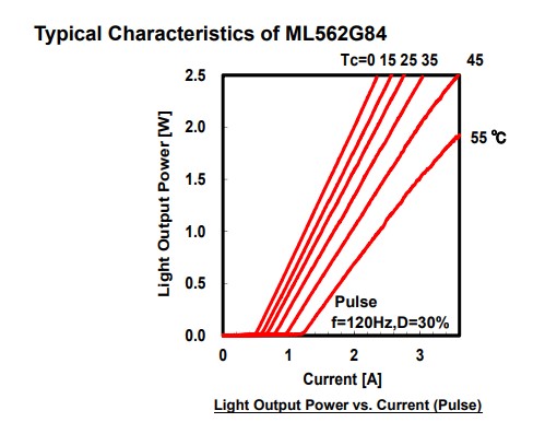 圖1三菱2.5 W 638 nm 半導體激光器(型號ML562G84)功率電流曲線(脈沖)