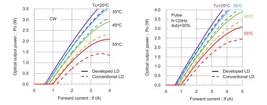 三菱于2009年發(fā)布用于彩色投影儀的638 nm半導體激光器,而后其輸出功率也在不斷突破,2010年推出連續(xù)工作功率500 mW產(chǎn)品, 2014年采用雙發(fā)光點將連續(xù)輸出功率提升至1.8W,2015年將發(fā)光點個數(shù)增加至3個,使脈沖輸出功率達到2.5W(ML562G84脈沖紅色大功率半導體激光器,性能見圖1)。2018年12月發(fā)布脈沖輸出功率3.0W產(chǎn)品- ML562G86(2019年4月正式發(fā)布),成為當年所報道的638 nm波段激光器中功率最高的半導體激光器[8],自此以后,三菱再無638nm新品推出。