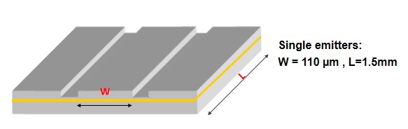 其中1 W 638 nm芯片采用110 μm發(fā)光條寬,腔長 1.5 mm的尺寸結構(見圖3),而2.5W 638nm芯片則采用三個發(fā)光點,每個發(fā)光點條寬為60μm、腔長1.5mm的尺寸結構(見圖4)。