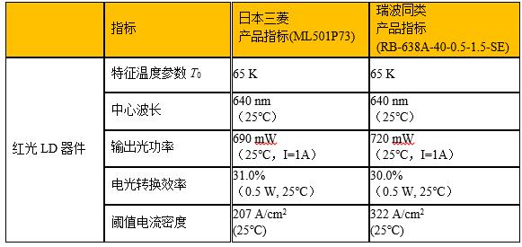 瑞波與三菱紅光芯片性能參數(shù)對比表(1.5 mm腔長, 40 μm條寬)