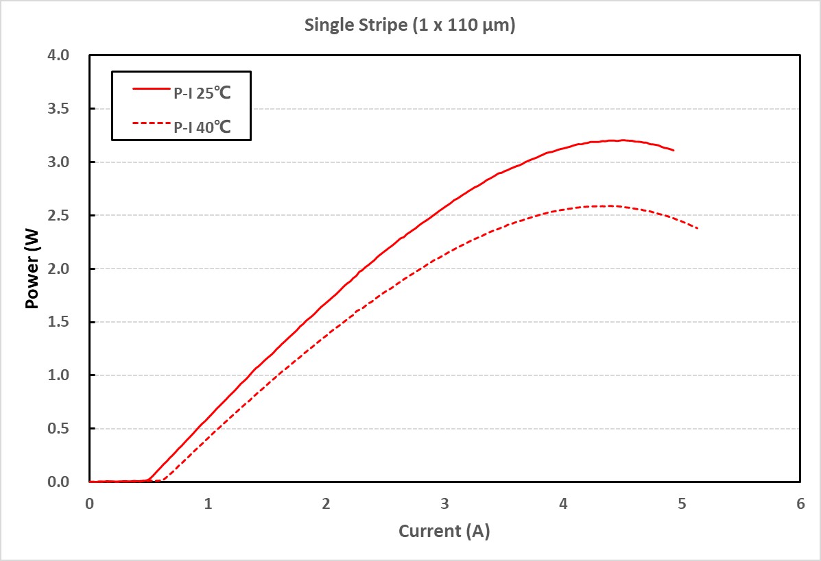 圖 5(b) 1W 638nm芯片在T=25℃和40℃、連續(xù)電流下P-I曲線