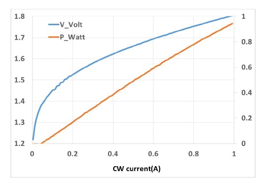 500mW級(jí)的980nm激光芯片腔長(zhǎng)4mm,工作電流500mA,斜率效率1.01W/A,光電轉(zhuǎn)換效率60%,快軸發(fā)散角(FWHM)為35.4°,慢軸發(fā)散角(FW95% Power)為6.74°。同時(shí)也積累的近萬(wàn)小時(shí)的可靠性數(shù)據(jù),MTTF壽命達(dá)到25萬(wàn)小時(shí)以上。
