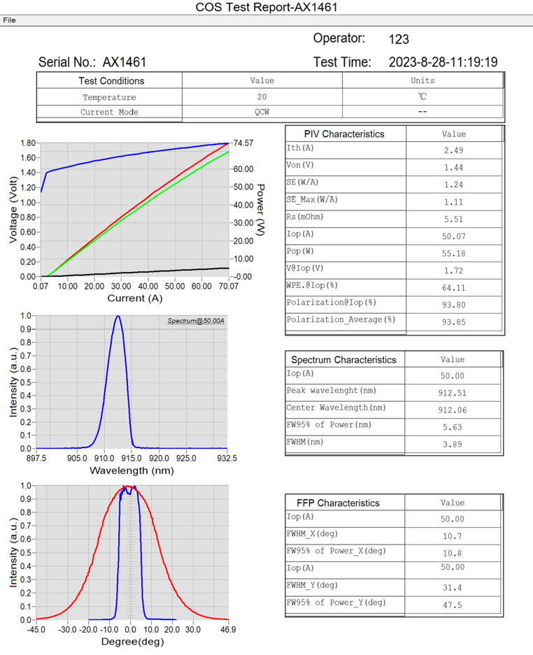 3、測試功能齊全,可在連續(xù)或者脈沖電流注入下自動測試LD的LIV特性、光譜特性、遠(yuǎn)場特性、偏振特性