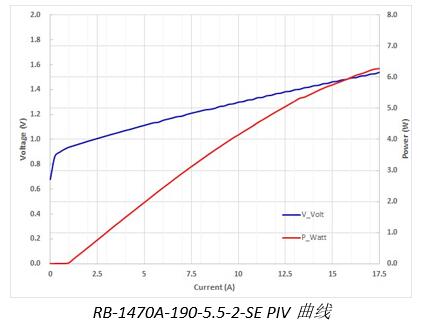 本次發(fā)布的1470nm芯片型號為RB-1470A-190-5.5-2-SE,發(fā)光條寬190μm,工作電流15A,工作功率5.5W,光電轉(zhuǎn)換效率26%。