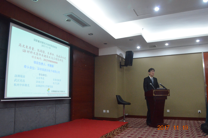 2017年11月19日,由我司牽頭承擔的國家重點研發(fā)計劃“戰(zhàn)略性先進電子材料”重點專項‘高光束質(zhì)量、低閾值、長壽命、低成本紅光LD材料與器件關鍵技術與工程化研究’(編號:2017YFB0404900)項目啟動會在深圳朗山酒店二樓郎睿廳舉行。