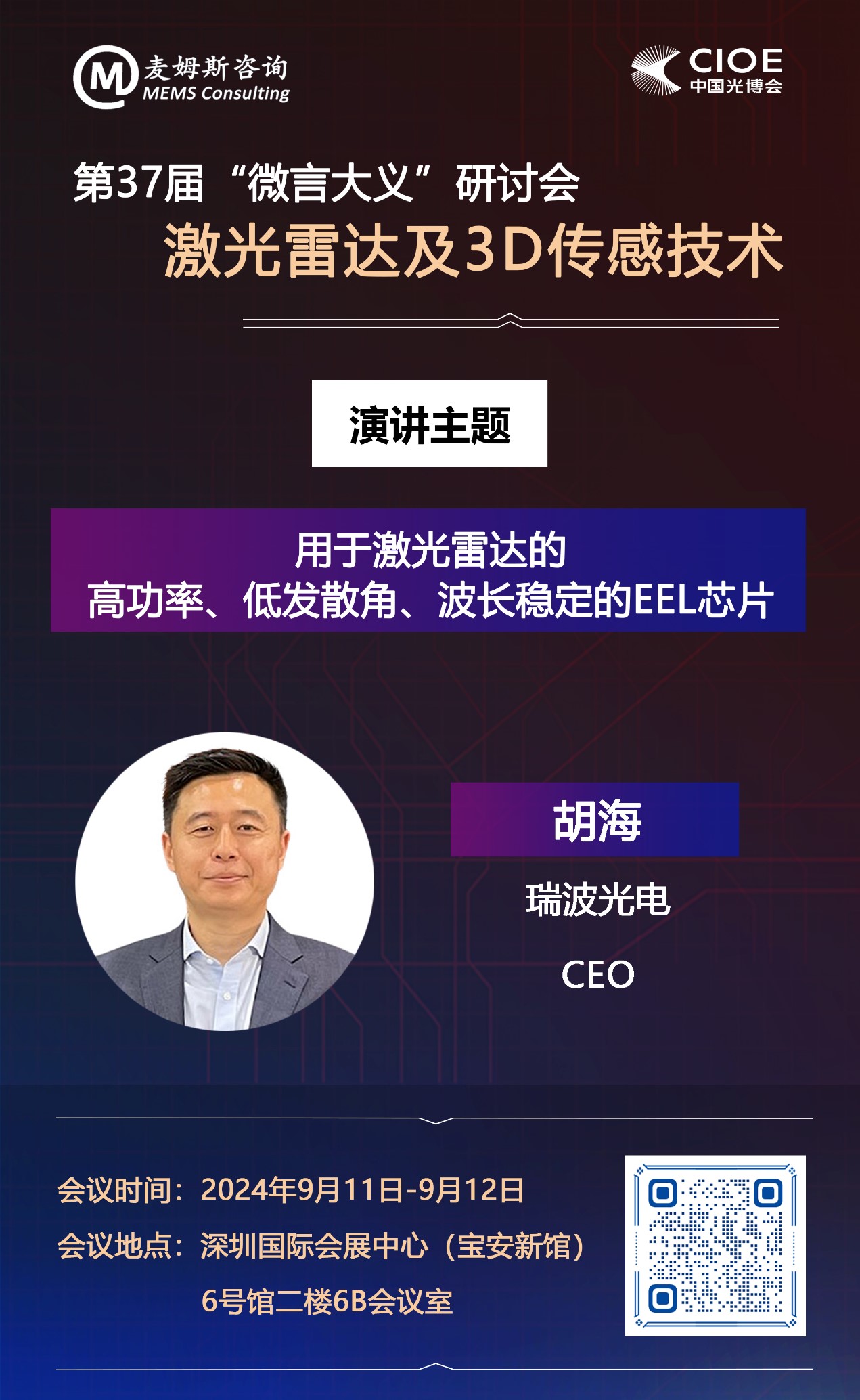 另外,瑞波光電總經(jīng)理胡海博士也將在同期舉行的“第37 屆“微言大義”研討會(huì):激光雷達(dá)及3D 傳感技術(shù)”上發(fā)表精彩演講,題目為:《用于激光雷達(dá)的高功率、低發(fā)散角、波長穩(wěn)定的EEL芯片》,論壇時(shí)間為2024 年9月11 日13 :00~17 :00;9月12 日9:30~17:00 (共計(jì)1.5 天),歡迎蒞臨聆聽。