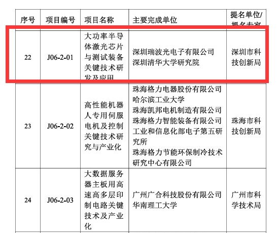 2024年10月17日,廣東省人民政府頒發(fā)了2023年度廣東省科學(xué)技術(shù)獎(jiǎng)的通報(bào)(粵府〔2024〕54號(hào)),瑞波光電作為第一完成單位申報(bào)的《大功率半導(dǎo)體激光芯片與測(cè)試設(shè)備關(guān)鍵技術(shù)研發(fā)及應(yīng)用》技術(shù)研發(fā)項(xiàng)目獲得2023年度廣東省科學(xué)技術(shù)獎(jiǎng)科技進(jìn)步二等獎(jiǎng)。
