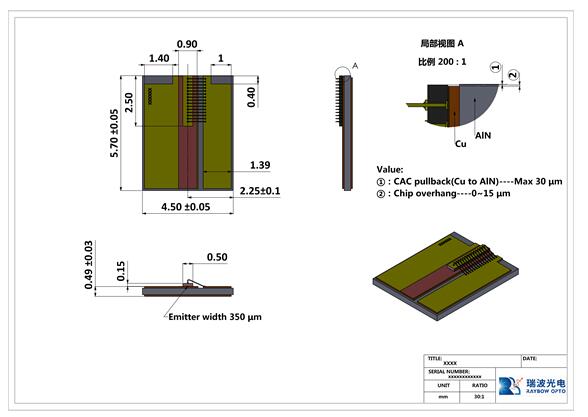 新款10W 808nm半導(dǎo)體激光芯片型號為RB-808B-350-10-2.5-SE,支持COS封裝,發(fā)光條寬為350μm,腔長2.5mm,光電轉(zhuǎn)換效率58%,使用壽命可達(dá)20000小時以上。另外該芯片也采用了新型外延結(jié)構(gòu)設(shè)計和材料外延,先進(jìn)的非泵浦窗設(shè)計和制備技術(shù)以及干濕法腐蝕結(jié)合自對準(zhǔn)工藝技術(shù),控制條寬的一致性,特別保證大批量生產(chǎn)下的高成品率,降低激光芯片成本。同時新技術(shù)的采用大大提高的耐高溫特性,使之可以在環(huán)境溫度60℃甚至更高溫的情況下連續(xù)工作。